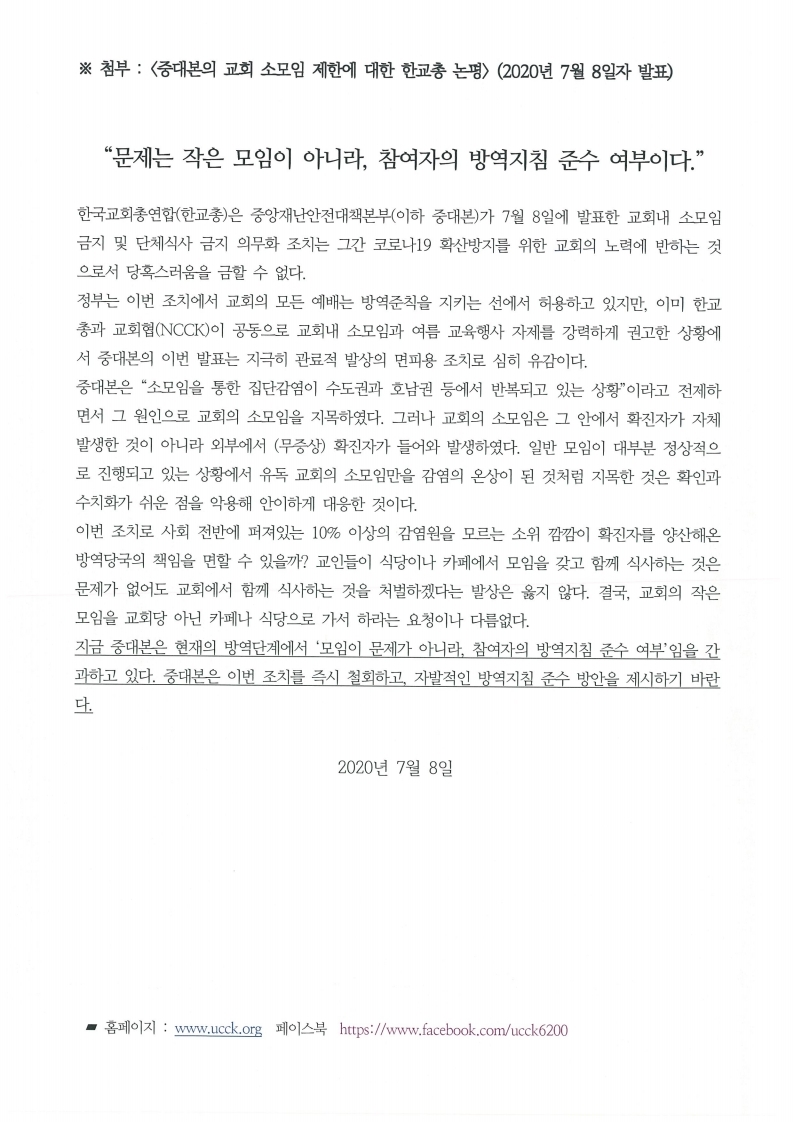 중대본의 소모임 금지 조치에 대한 입장과 안내 요청.